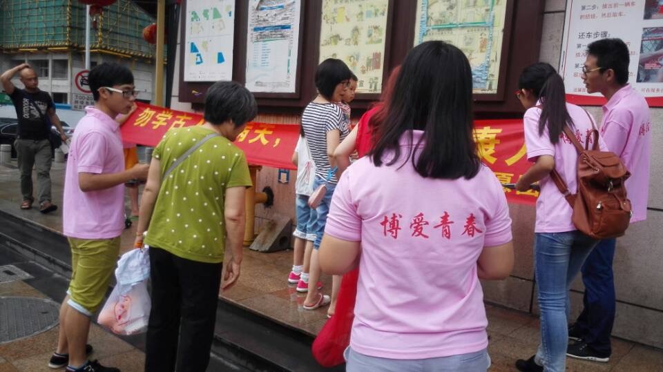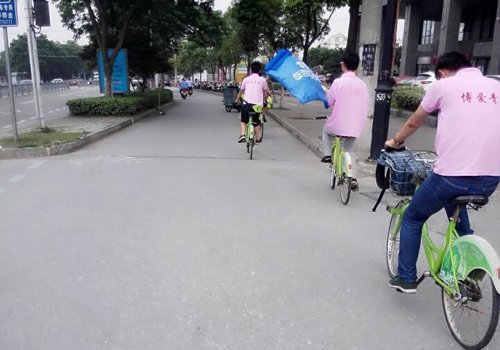 7月21日,志愿者们为了加强活动的影响力,选择了骑行。活动前期考虑到环保问题,于是选择租借学校附近的绿色自行车作为交通工具。下午1点半大家穿着统一的服装,骑着绿色的自行车出发了。他们排着整齐的队伍,形成了一道亮丽的风景线。当天天气闷热,大家即使汗流浃背却没有一人放弃或者掉队。在快到达终点站-观前街时突然下起了大雨,大家依旧没有放弃,仍毅然前行。他们心里明白,今天是为了宣传禁毒防艾滋,从事志愿服务活动,这是一件非常有意义的事情,所以都坚持到了最后。到达观前街后大家都累得气喘吁吁,但是却会心地笑了,因为这一路的骑行达到了预期的宣传效果,为禁毒防艾滋事业献上了每个人的一份力量,一个人的力量或许微不足道,但是团队的力量会发挥“1+1>2”的效果。